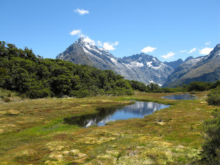 Před námi byl ještě celý den, takže jsme si vyhlídky další výlet, nebo spíš výstup na „Key Summit“, kde se jde z části po stejné trase, jako když jdete Routeburn track. Jak už jsem psal na začátku, je to jedna z devíti velkých tras na NZ. Až zhruba po jedné hodině se odbočuje na 919m vysoký vrchol. Opět se šlo celou dobu do prudkého kopce, opět jsem z toho byl rozmrzelý a opět na konci překvapený. :-) Výhledy neskutečné a na vrcholku bylo několik malých jezírek, ve kterých se odrážely špičky okolních hor pokrytých sněhem.