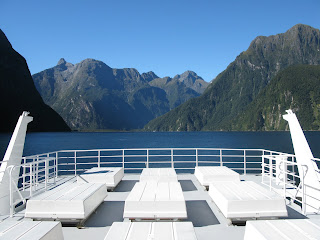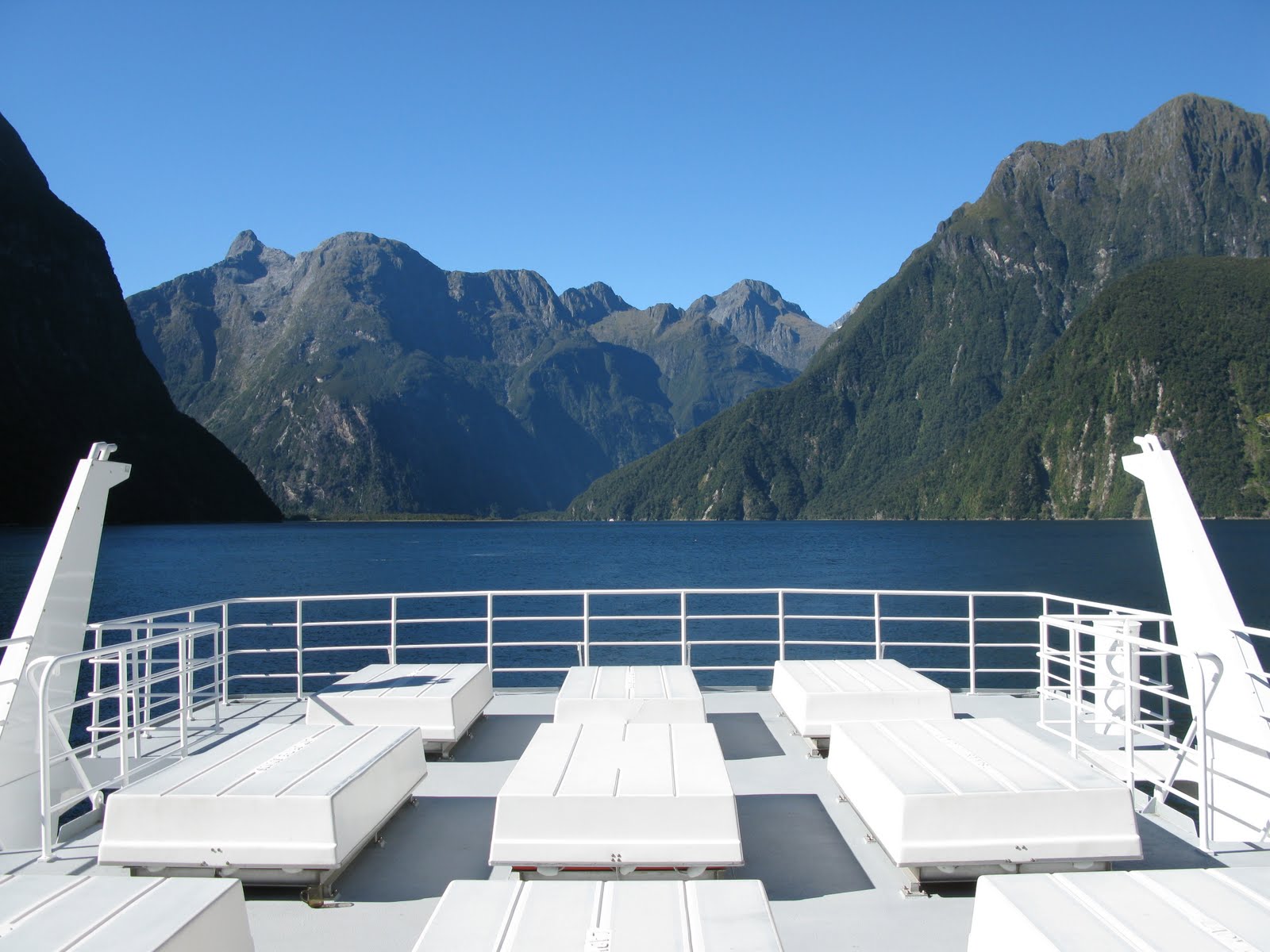 Ráno po probuzení sluníčko hezky osvětlovalo štíty okolních hor a nám bylo jasné, že jsme opět trefili super výlet do ještě lepšího počasí. Musím to zaklepat, ale máme zatím štěstí. Posunuli jsme se o deset kilometrů na parkoviště Milford Sound a šli si pro palubní lístky do společnosti Southern Discoveries, na základě naší internetové rezervace. Po pár minutách se šlo na loď, kde na nás čekala snídaně v podobě švédských stolů. Stihli jsme posnídat ještě před tím, než se kapitán chopil kormidla a otočil loď mezi úžiny. Takže nám nic neuteklo a my se po snídani odebrali nahoru na palubu, kde jsme měli krásný výhled do všech stran. Obloha úplně jasná hned od rána, sluníčko hezky svítilo a my si vychutnávali panorámata Milfordu. Celá plavba trvala necelé dvě hodiny, během kterých jsme udělali spousty fotek, které jsme pak museli dost promazávat, protože jich bylo spousty stejných. Na závěr plavby ještě kapitán najel pod velký vodopád, který nás všechny „osprchoval“ jemnými kapkami a jelo se do přístavu. Během celé plavby se každý mohl občerstvit kávou nebo čajem, který byl samozřejmě zdarma a přišel vhod po delším fotografování, kdy měl každý prokřehlé prsty. Po vylodění jsme si mohli zakoupit DVD s naší fotkou a dalšími prospekty za 30 dolarů. V tomhle případě to ale nebylo nutné, měli jsme kvanta vlastních fotek, takže jsme odmítli a šli k autu.